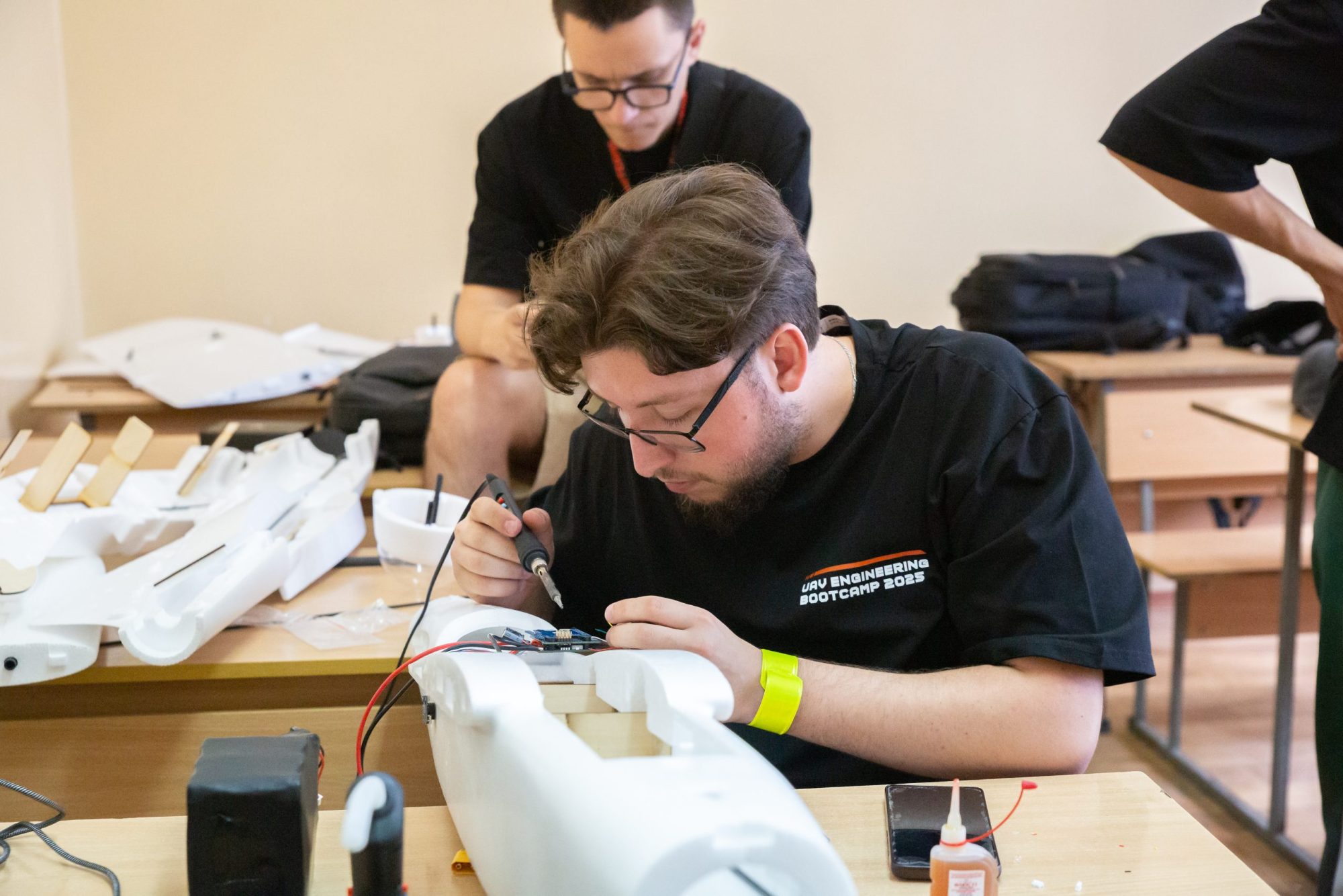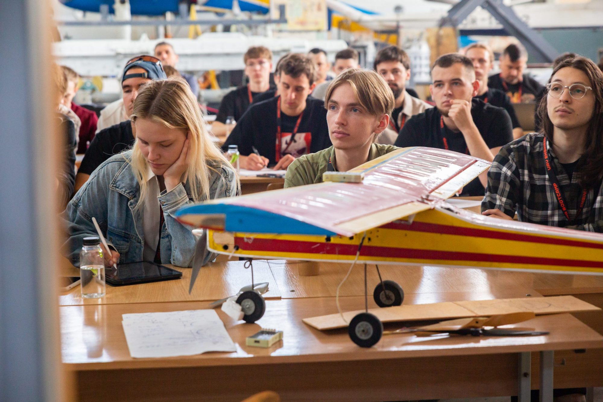 Щоранку — лекції інженерів компаній про зв’язок у бойових умовах, принципи автопілотів і композити. Далі — лабораторії, експерименти, налаштування контролерів і випробування в аеродинамічній трубі КАІ.